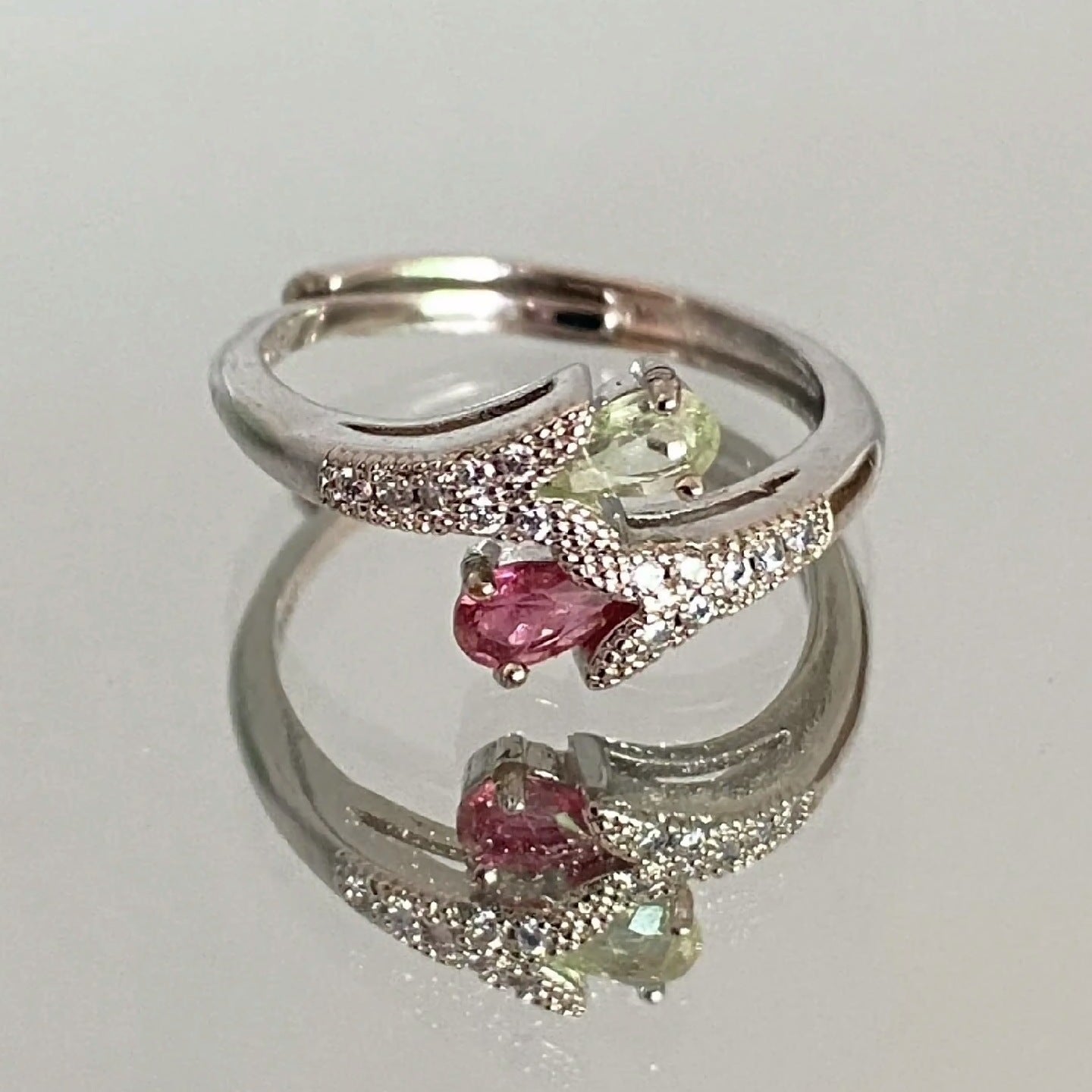 Silver Floral Ring with Rose & Green Tourmaline, Adjustable
